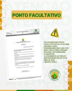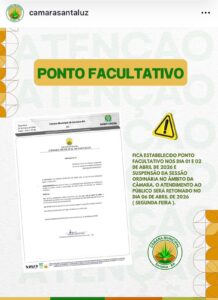 A Câmara Municipal informa que foi decretado ponto facultativo nos dias 01 e 02 de abril