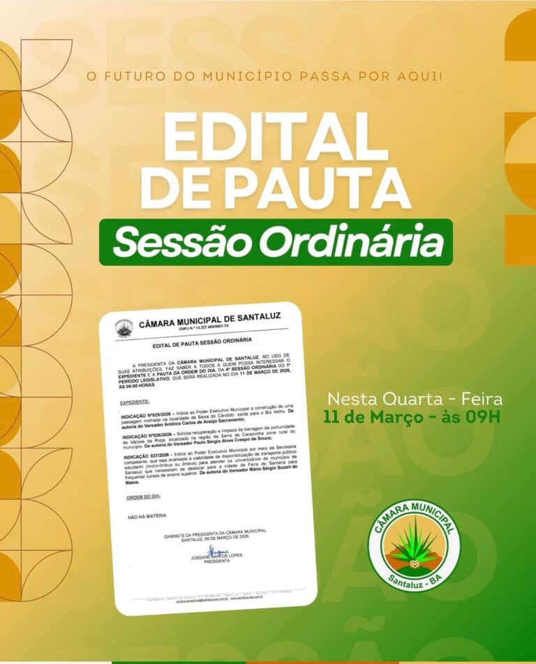 A PRESIDENTA DA CÂMARA MUNICIPAL DE SANTALUZ, NO USO DE SUAS ATRIBUIÇÕES, FAZ SABER A TODOS A QUEM POSSA INTERESSAR O EXPEDIENTE E A PAUTA DA ORDEM DO DIA, DA 4ª SESSÃO ORDINÁRIA DO 1º PERIODO LEGISLATIVO, QUE SERA REALIZADA NO DIA 04 DE MARÇO DE 2026, AS 09:00 HORAS.